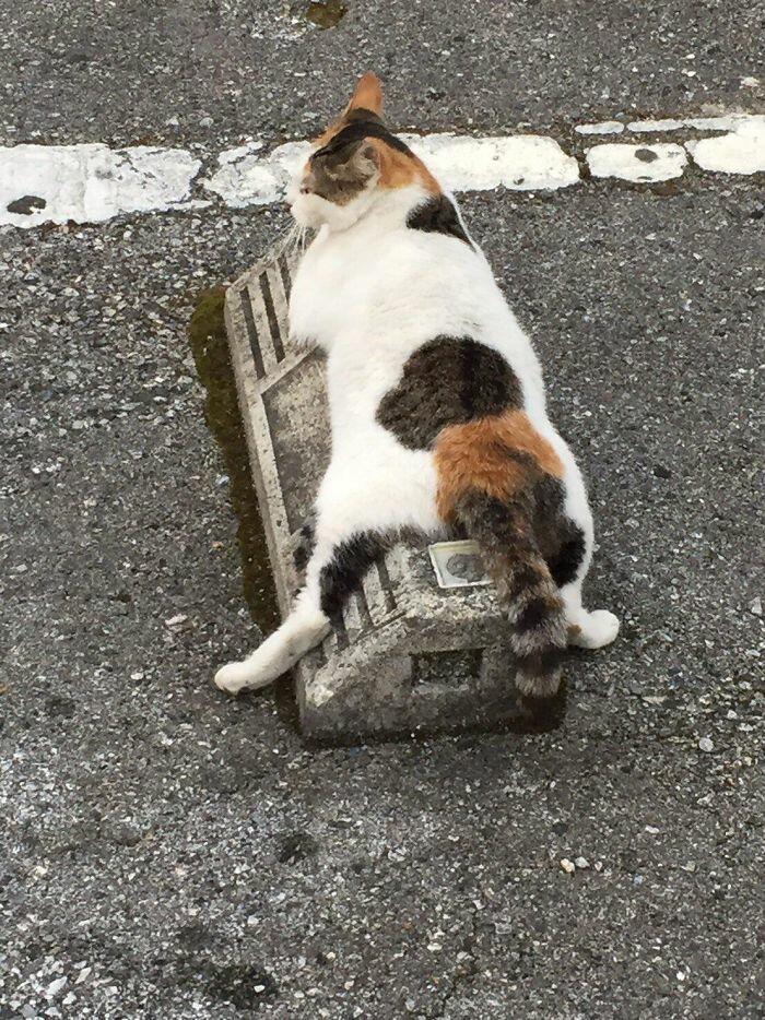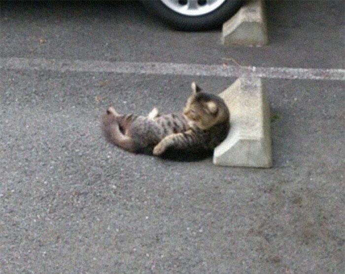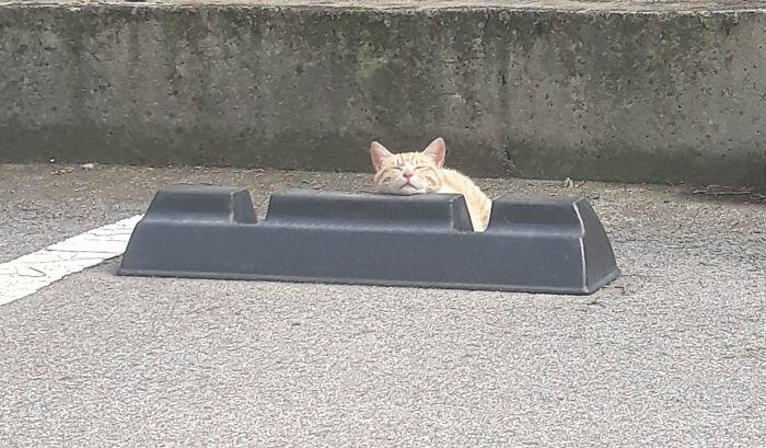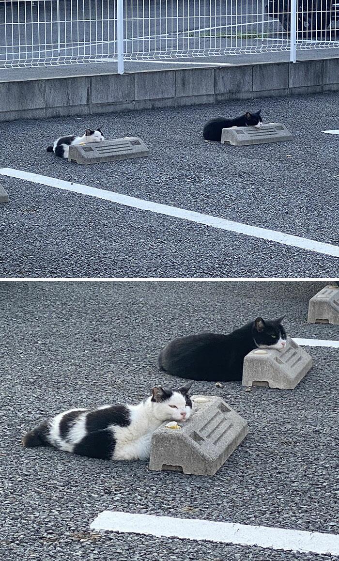 Житель Японии разместил в сети фото кошек, которые решили использовать бетонные парковочные барьеры в качестве подушек и лежаков.