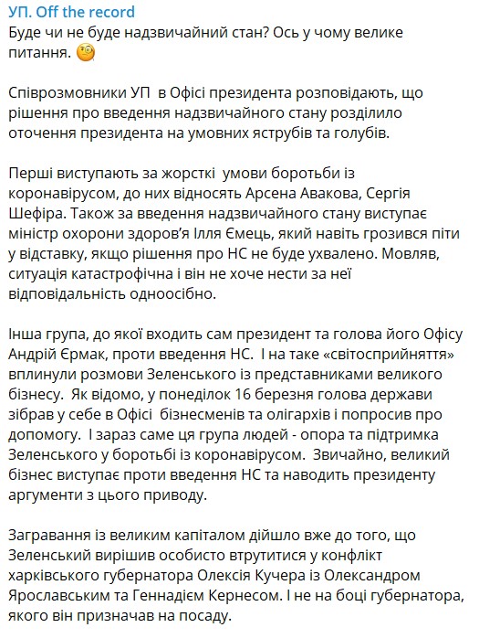 Собеседники издания в Офисе президента рассказывают, что "решение о введении чрезвычайного положения разделило окружения президента на условных ястребов и голубей".