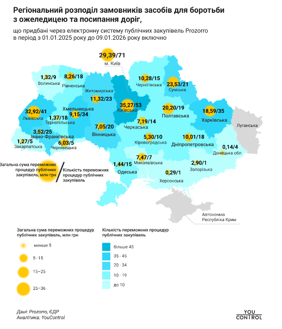 Наиболее активно противообледенительные средства закупали в Киевской и Львовской областях — суммы контрактов там достигли 35,3 млн грн и 32,9 млн грн соответственно. Также значительные расходы зафиксированы в Киеве (29,4 млн грн), Сумской области (23,5 млн грн) и Полтавской области (20,2 млн грн). В целом в течение 2025 года закупки проводили 395 учреждений, среди которых органы местного самоуправления, коммунальные и государственные предприятия.