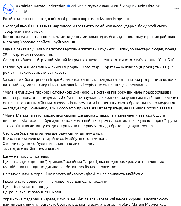 По информации Украинской федерации карате, погиб шестилетний спортсмен столичного клуба каратэ Сен-Бин. Там рассказали, что Матвей был самым маленьким ребенком в семье. Его старшие братья также занимаются каратэ.