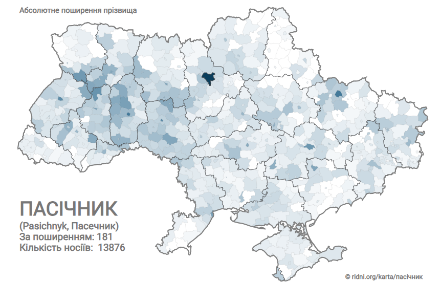 Чаще встречается на Волыни, а Теофипольский район является самым густым центром этой фамилии, где на одного носителя приходится 198 жителей. Происходит она от прилагательного пасечный – "относящийся к местной пасеке".