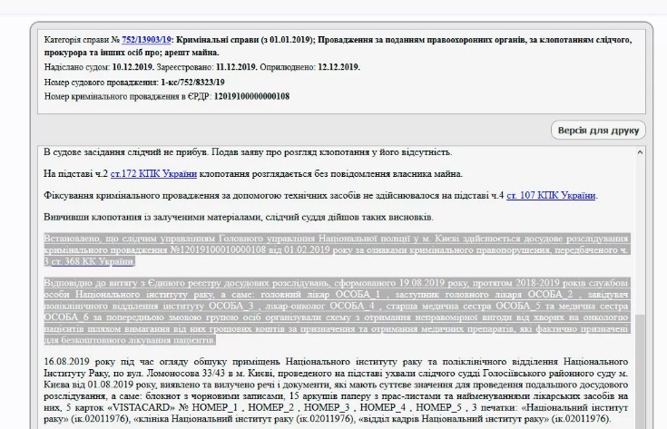 "На протяжении 2018−2019 годов служебные лица Национального института рака, а именно: главный врач ЛИЦО1, заместитель главного врача ЛИЦО2, заведующий поликлиническим отделением института ЛИЦО3, врач-онколог ЛИЦО4, старшая медицинская сестра ЛИЦО5 и медицинская сестра ЛИЦО6 по сговору организовали схему получения неправомерной выгоды от больных онкологией пациентов путем вымогательства денежных средств за назначение и получение медицинских препаратов, которые предназначены для бесплатного лечения".