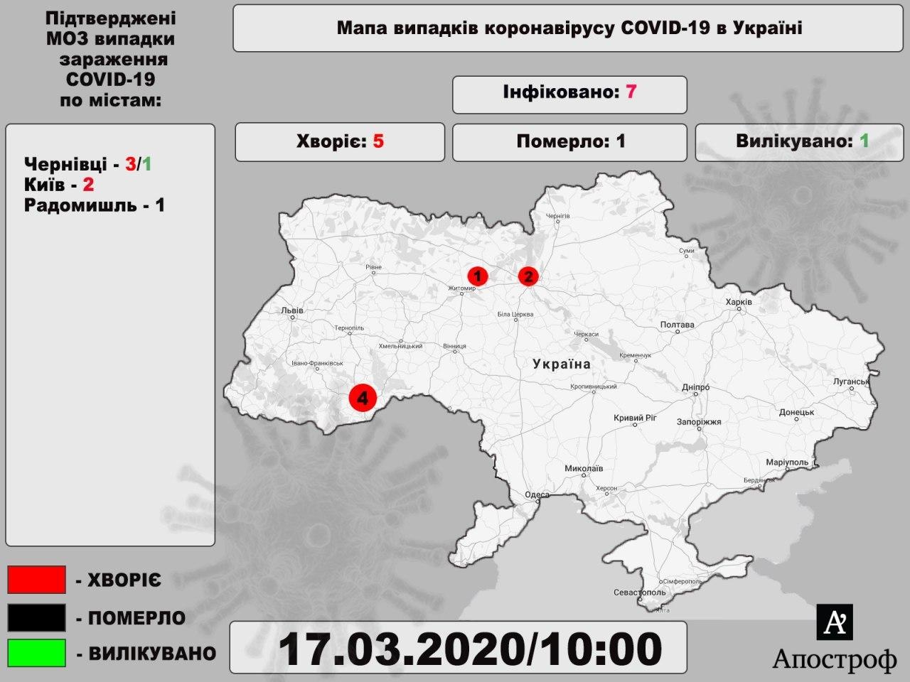 По состоянию на вторник, 17 марта, в Украине зафиксировали семь случаев коронавируса, в трех областях Украины, из них один с летальным исходом.
