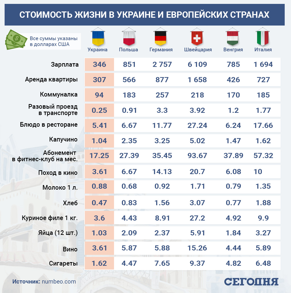 В Украине средняя зарплата составляет всего 346 долл. (9571 грн), в то время как аренда жилья в крупных городах достигает 307 долларов, а за коммуналку нужно заплатить 94 долл. Зато в транспорте у нас можно проехаться за 0,25 долл., а абонемент в фитнес-зал на месяц купить всего за 17,25 долл. Разовый поход в кино обойдется украинцам в 3,6 долл., а чашка капучино 1,04.