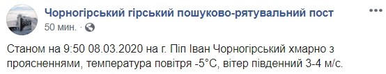 "По состоянию на 9:50 08.03.2020 на г. Поп Иван Черногорский облачно с прояснениями, температура воздуха -5 ° С, ветер южный 3-4 м / с.", - говорится в сообщении.