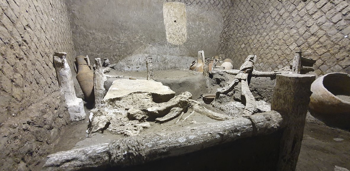 Во время раскопок в древнем городе Помпеи археологи нашли хорошо сохранившуюся комнату, в которой, очевидно, когда-то жили рабы. Обнаружены три деревянных кровати, одна из которых – детская, ночной горшок и деревянный ящик с металлическими и тканевыми предметами. В помещении площадью в 16 квадратных метров было одно маленькое верхнее окно. Об украшении стен никаких показаний нет. Под кроватями были обнаружены большие амфоры, используемые для хранения личных вещей, и керамические кувшины. Город покрывал многометровый слой пепла и пемзы из-за извержения вулкана Везувий в 79 году н. е. Все предметы в комнате истлели за два тысячелетия, однако оставили в почве пустоты, которые во время раскопок заливают гипсом и получают объемные модели предметов. Так археологам удалось восстановить в гипсе вещи и мебель в помещении рабов.