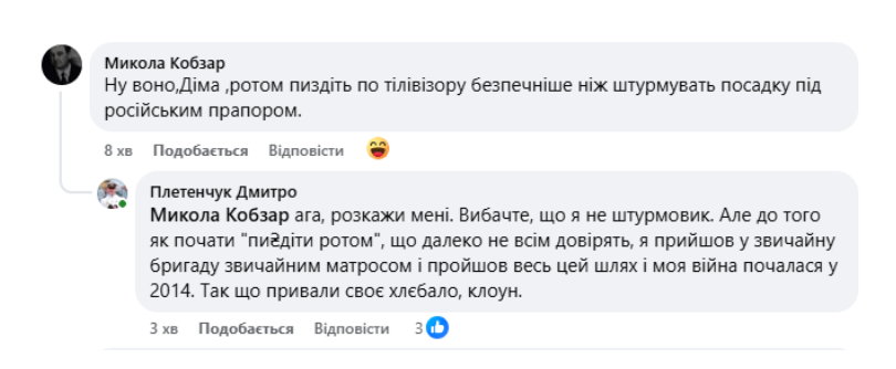 "Ага, расскажи мне. Извините, что я не штурмовик. Но до того как начать "п***ть ртом", что далеко не всем доверят, я пришел в обычную бригаду обычным матросом и прошел весь этот путь и моя война началась в 2014. Так что завали свое хлебало, клоун", - отметил спикер.