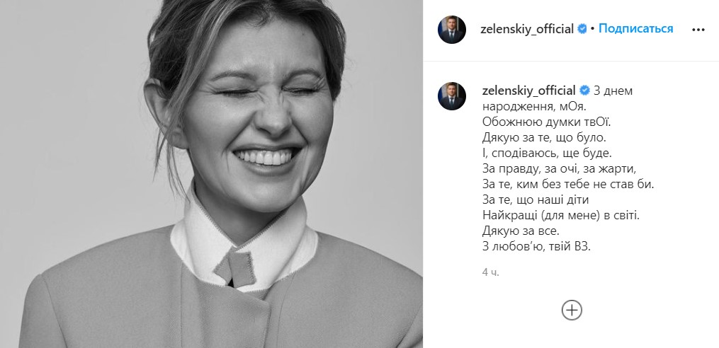 Президент представил стих на украинском языке, в котором признался, что обожает свою супругу. Также Владимир Александрович поблагодарил Елену Зеленскую за то что было, и что будет. Президент Украины благодарит свою супругу за шутки и за поддержку. В своем стихотворении президент отметил, что без Елены он не стал бы тем, кем является сейчас.