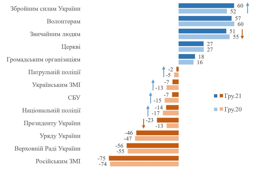 Как говорится в сообщении, все остальные 8 институтов имеют отрицательный баланс доверия-недоверия. Среди респондентов преобладает недоверие к институциям центральной власти (президенту, парламенту, правительству), правоохранительным органам (национальная полиция, патрульная полиция, СБУ), СМИ (как украинским, так и российским).