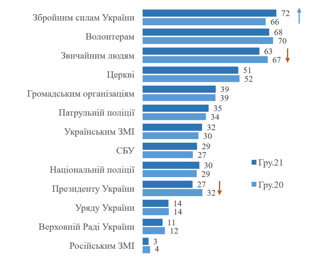По результатам последнего опроса, наибольшее доверие среди украинцев традиционно имеют волонтеры и армия. Растет показатель доверия к ВСУ, президенту доверяют меньше.