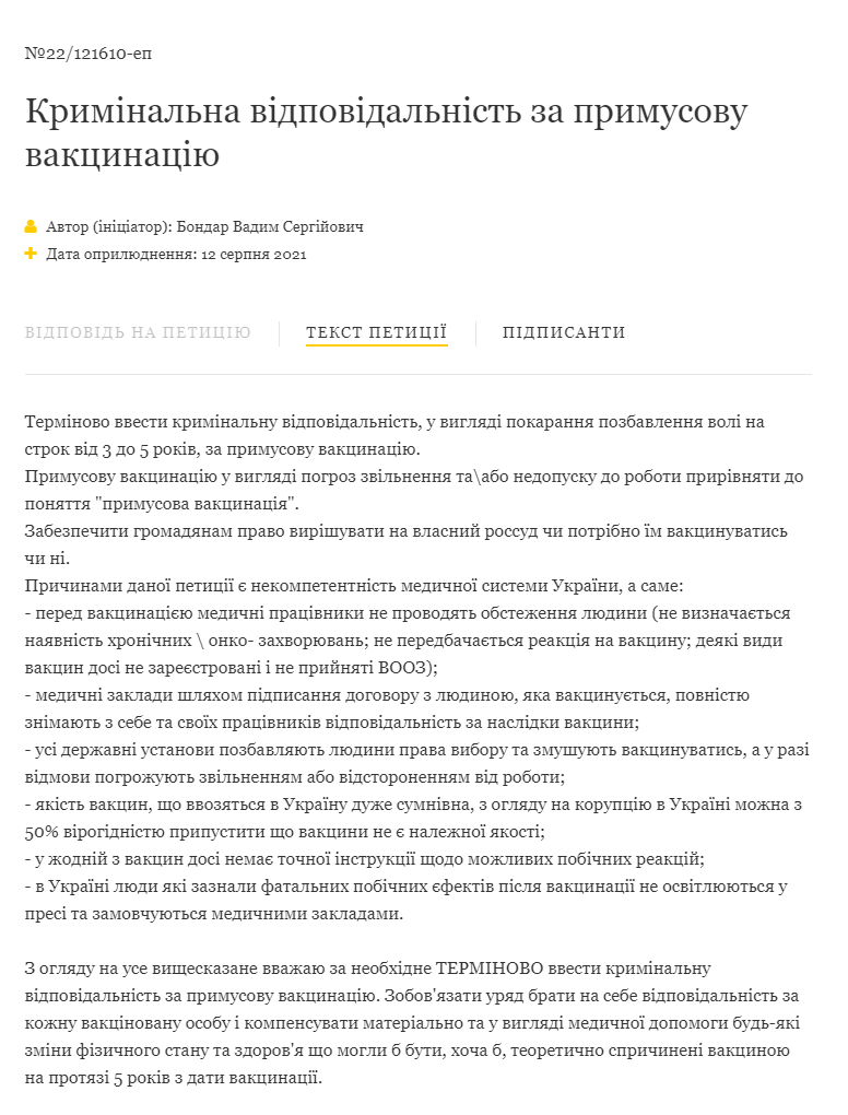 "Срочно ввести уголовную ответственность в виде наказания лишения свободы на срок от 3 до 5 лет за принудительную вакцинацию. Принудительную вакцинацию в виде угроз увольнением и/или недопуском к работе приравнять к понятию "принудительная вакцинация", - пишет автор Вадим Бондар.