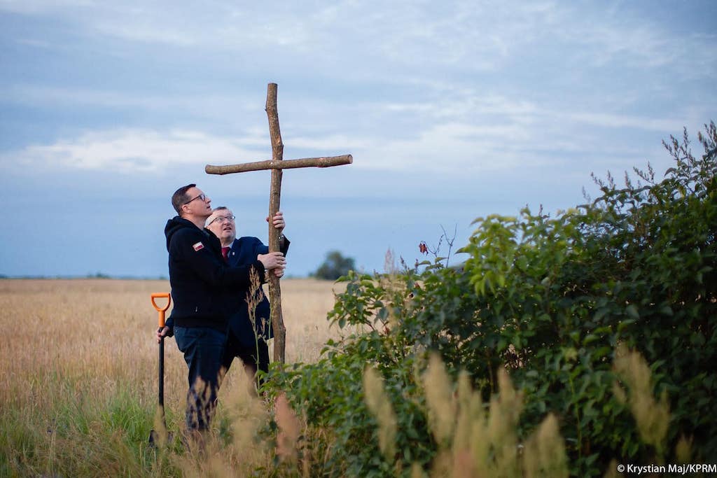В Украину также приехал премьер-министр Польши Матеуш Моравецкий, который почтил память жертв Волынской трагедии на территории несуществующего села Островки. В ходе церемонии он установил в поле деревянный крест.