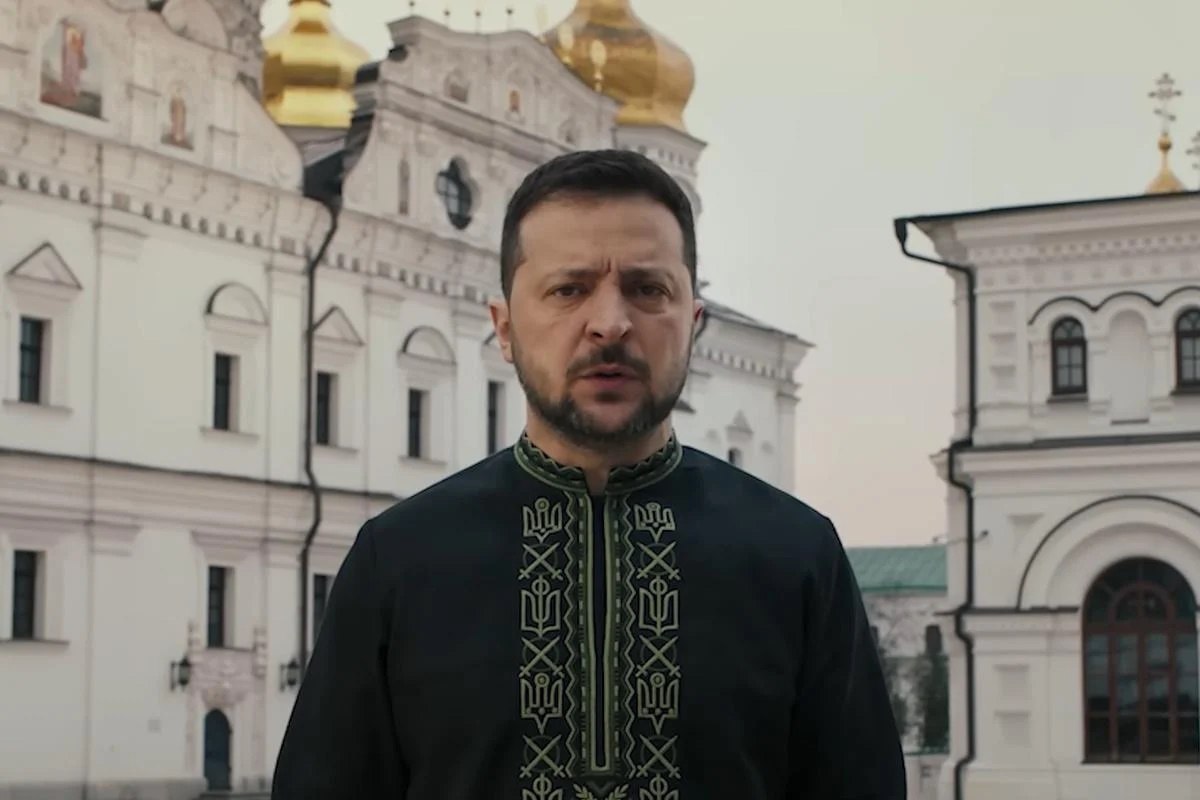 Президент Украины Владимир Зеленский поздравил украинцев с Пасхой в темной вышиванке с символами Киевской Руси.