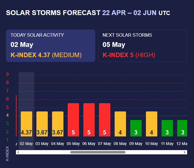 После небольшой паузы по Земле снова ударит магнитная буря красного уровня – с 5 по 7 мая ожидается солнечный шторм с К-индексом 5.