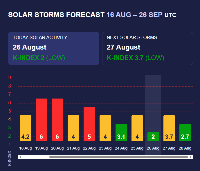 По прогнозам специалистов, 27 августа Землю атакует магнитная буря с К-индексом 3,7, что может вызвать дискомфорт у чувствительных людей. Следует заметить, что эксперты не дают долгосрочного прогноза колебаний геомагнитного поля Земли, поскольку солнечная активность очень изменчива и ситуация может изменяться даже до нескольких раз в сутки.