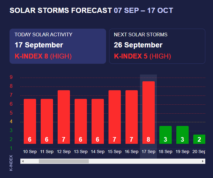 С 10 сентября Земля находится под влиянием повышенной солнечной активности, что вызывает сдвиг геомагнитного поля Земли. 17 сентября зафиксирован пик магнитной бури.