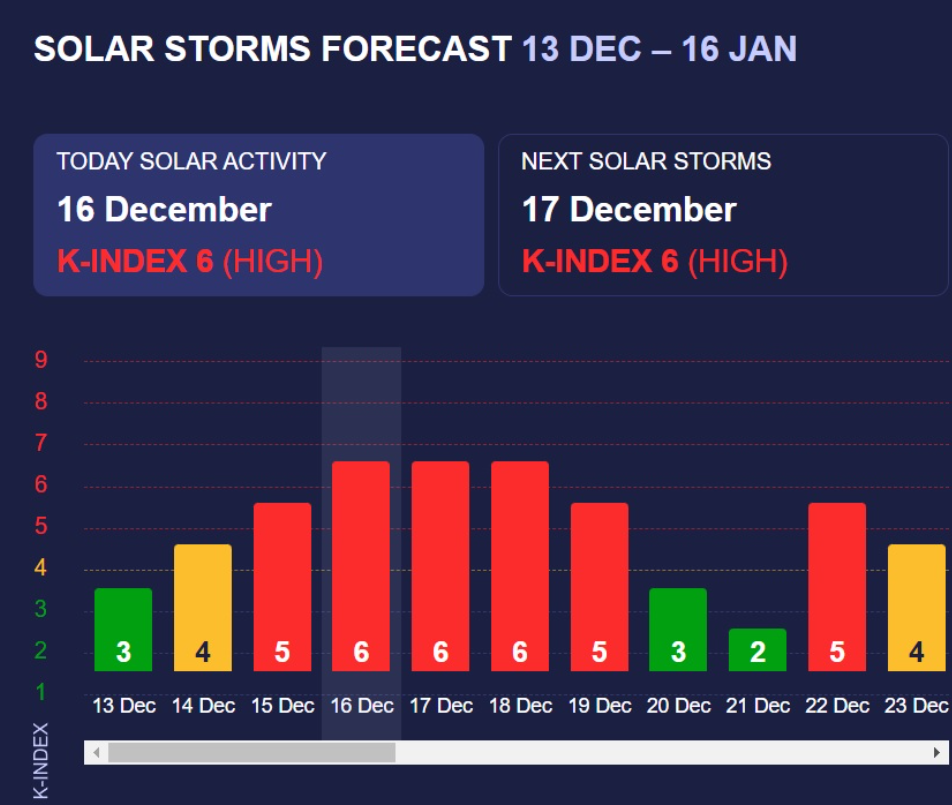 По данным сайта Meteoagent, 15 декабря К-индекс достигал 5 баллов, а уже в течение 16-18 декабря он превышает 6 баллов. С 19 декабря бури прекратятся, но уже с 22 числа снова ожидается мощная вспышка в 5 баллов.