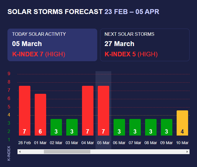 Эксперты зафиксировали солнечную активность с К-индексом 7 (красный уровень), что соответствует очень сильной магнитной буре.