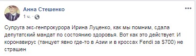 "Супруга экс-генпрокурора Ирина Луценко, как мы помним, сдала депутатский мандат по состоянию здоровья. Вот как это действует. И коронавирус (танцует явно где-то в Азии и в кроссах Fendi за $700) не страшен", - заметила в Facebookжурналистка Анна Стешенко.