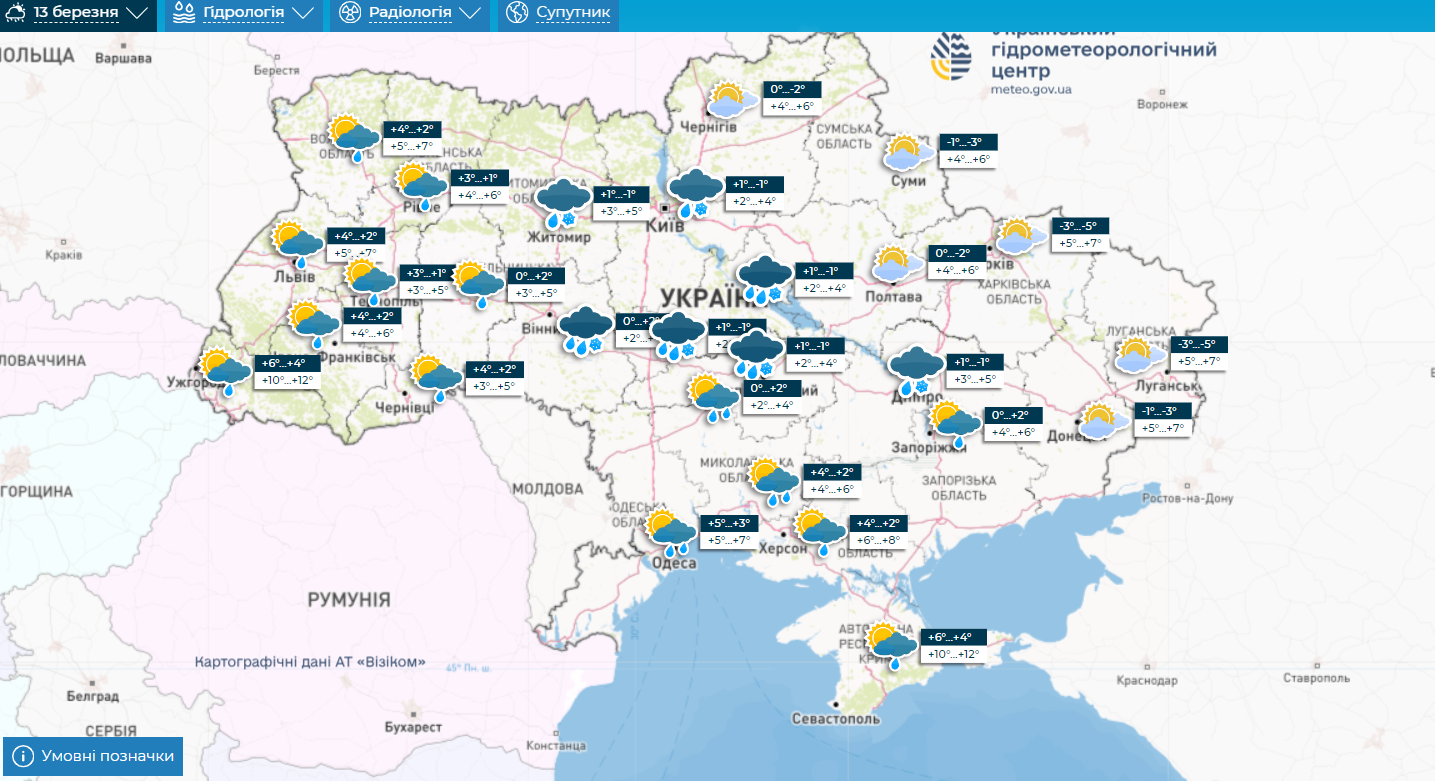 В среду, 13 марта, Украину накроет осадками, мокрый снег и дождь следует ожидать повсюду, кроме восточных и северо-восточных областей. Средняя температура будет оставаться в диапазоне 2-5° тепла, а в Закарпатье достигнет 12° тепла.
