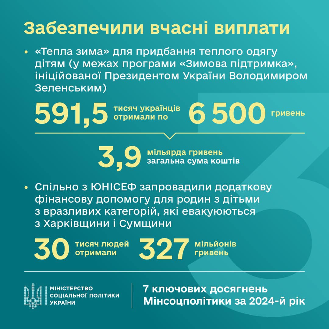 По информации пресс-службы министерства, на сегодняшний день 591,5 тыс. украинцев получили по 6500 грн на приобретение теплой детской одежды в рамках программы "Зимняя поддержка". Всего в настоящее время использовано 3,9 млрд грн.