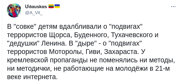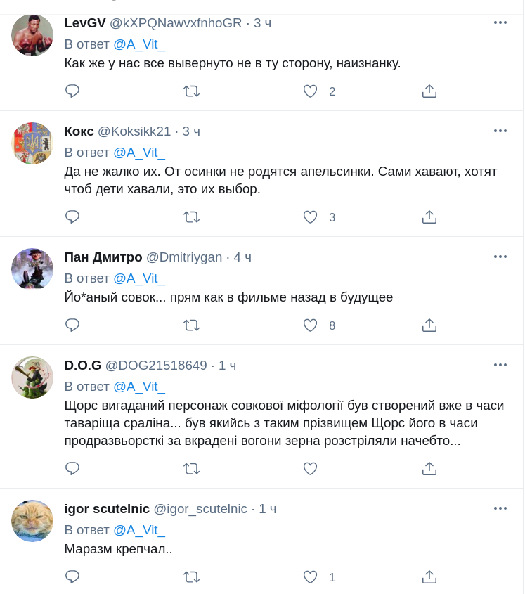 "Маразм крепчал", "Просто до деоккупации надо принять закон о коллаборационизме и внести изменения в действующее законодательство", "В совке детям вдалбливали в голову о "подвигах" Щорса, Тухачевского и Ленина, а в дыре - о подвигах террористов Моторолы, Гиви, Захараста. У кремлевской пропаганды не поменялись ни методы, ни методички, не работающие на молодежи в 21-м веке интернета ", - написали пользователи.