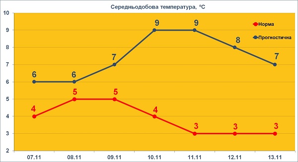 "В воскресенье, 9 ноября, и в начале следующей недели, 10-12 ноября корректировать погодные условия будет локальный циклон, который будет перемещаться с Румынии на Киевщину. Он принесет значительные осадки и похолодание в западные области Украины. Черкасская область окажется в теплом секторе этого циклона, поэтому получит дополнительное тепло и небольшие и умеренные дожди. 9-10 ноября, температурный фон повысится на 2-3 º: ночью 3-8 º, днем 9-14 º тепла", – пишет синоптик.