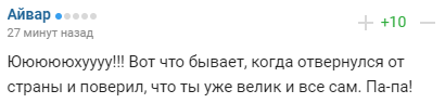 "Юююююхуууу!!! Вот что бывает, когда отвернулся от страны и поверил, что ты уже велик и все сам. Па-па!", - пишут пользователи.