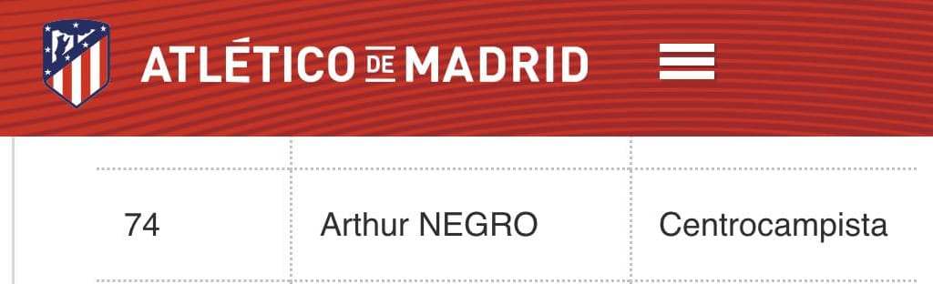 Защитника российского клуба Артура Черного сотрудники "Атлетико" представили как полузащитника, причем перевели его фамилию на испанский язык таким образом, что он стал Артуром Негро (Arthur Negro).