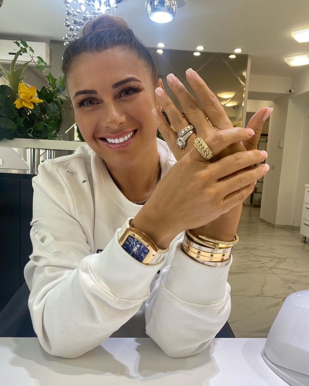 Продан впервые посетила клуб в деловом костюме, который украсила розами.