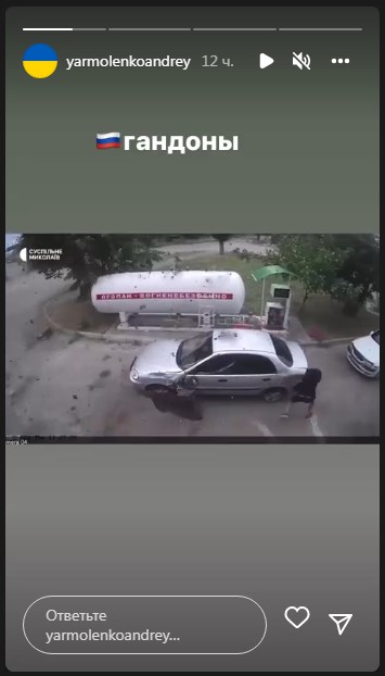 Ярмоленко опубликовал в соцсети несколько роликов, на которых показано, как армия РФ обстреляла территорию заправки, на которой в это время находились мирные люди. Действия россиян Андрей прокомментировал лаконично, но емко. "Гандоны", - написал он.