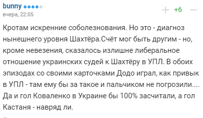 "Кротам искренние соболезнования. Но это - диагноз нынешнего уровня Шахтера.Счет мог быть другим - но, кроме невезения, сказалось излишне либеральное отношение украинских судей к Шахтеру в УПЛ. В обоих эпизодах со своими карточками Додо играл, как привык в УПЛ - там ему бы за такое и пальчиком не погрозили.... Да и гол Коваленко в Украине бы 100% засчитали, а гол Кастаня - навряд ли".
