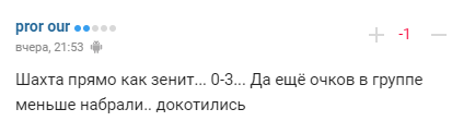 "Шахта прямо как зенит... 0-3... Да еще очков в группе меньше набрали.. докотились".