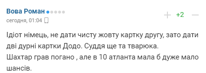 "Идиот немец, не дать чистую желтую карточку вторую, зато дать две глупые карточки Додо. Судья еще и тварь. Шахтер играл плохо, но в 10 атланта должна очень мало шансов".