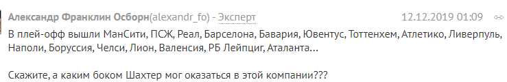 "В плей-офф вышли МанСити, ПСЖ, Реал, Барселона, Бавария, Ювентус, Тоттенхем, Атлетико, Ливерпуль, Наполи, Боруссия, Челси, Лион, Валенсия, РБ Лейпциг, Аталанта... Скажите, а каким боком Шахтер мог оказаться в этой компании???"