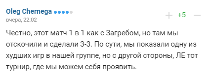 "Честно, этот матч 1 в 1 как с Загребом, но там мы отскочили и сделали 3-3. По сути, мы показали одну из худших игр в нашей группе, но с другой стороны, ЛЕ тот турнир, где мы можем себя проявить".