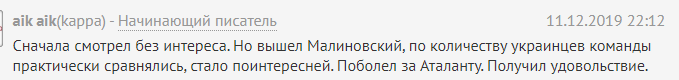 "Сначала смотрел без интереса. Но вышел Малиновский, по количеству украинцев команды практически сравнялись, стало поинтересней. Поболел за Аталанту. Получил удовольствие".