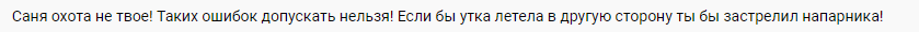 "Саня, охота не твое! Таких ошибок допускать нельзя! Если бы утка летела в другую сторону ты бы застрелил напарника!"