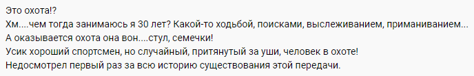 "Это охота!? Хм....чем тогда занимаюсь я 30 лет? Какой-то ходьбой, поисками, выслеживанием, приманиванием... А оказывается охота она вон....стул, семечки! Усик хороший спортсмен, но случайный, притянутый за уши, человек в охоте!"