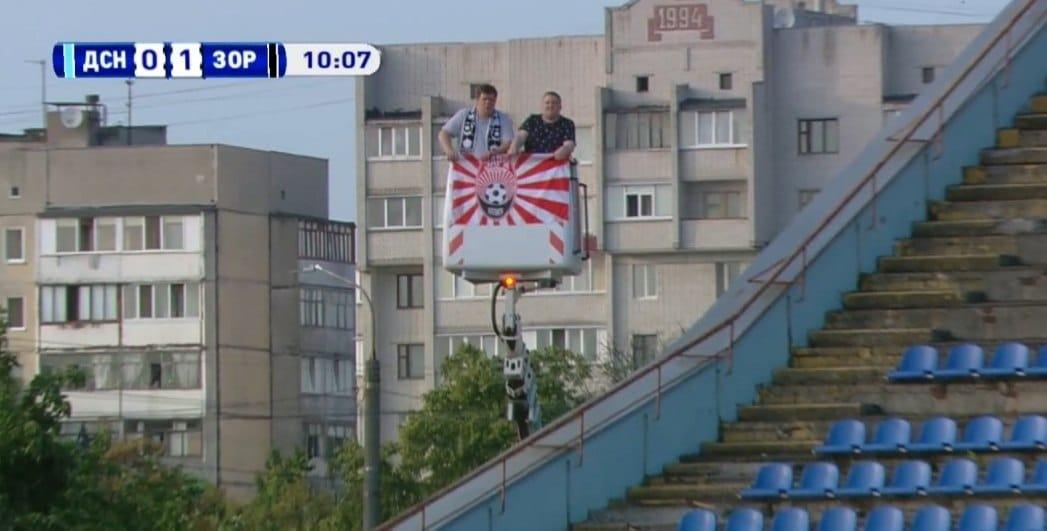 Болельщики луганской "Зари" арендовали автомобильную вышку, чтобы посмотреть матч 27-го тура чемпионата Украины с "Десной".