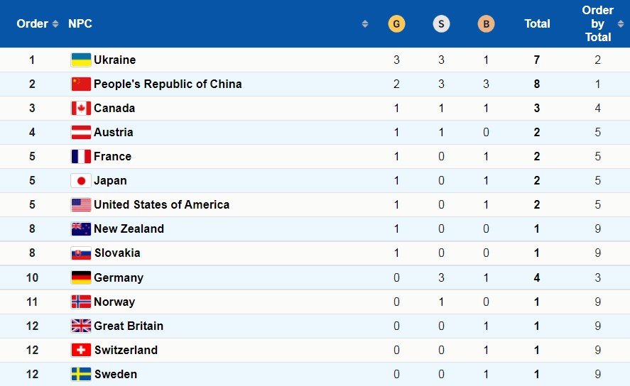 Главным преследователем Украины в медальном зачете на данный момент является Китай. Хозяева Игр в Пекине завоевали два "золота", три "серебра" и три "бронзы". На третьем месте расположилась Канада, в активе которой три награды.
