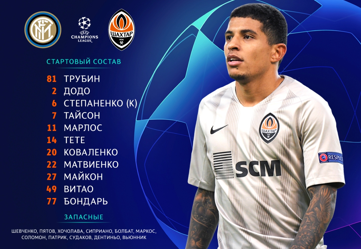 "Шахтер": Трубин, Витао (Хочолава, 36), Матвиенко, Додо, Бондарь, Тете (Соломон, 65), Коваленко, Марлос (Алан Патрик, 64), Степаненко, Тайсон (Дентиньо, 86), Майкон.