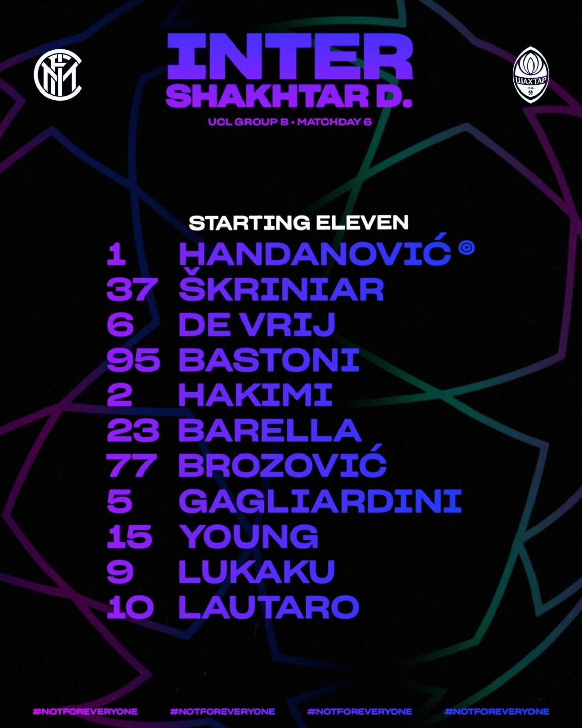 "Интер": Ханданович, Янг (Перишич, 68), Бастони (Д`Амброзио, 85), Шкриньяр, Хакими (Дармиан, 85), Барелла, Гальярдини (Санчес, 75), Брозович, де Врей, Мартинес (Эриксен, 85), Лукаку.