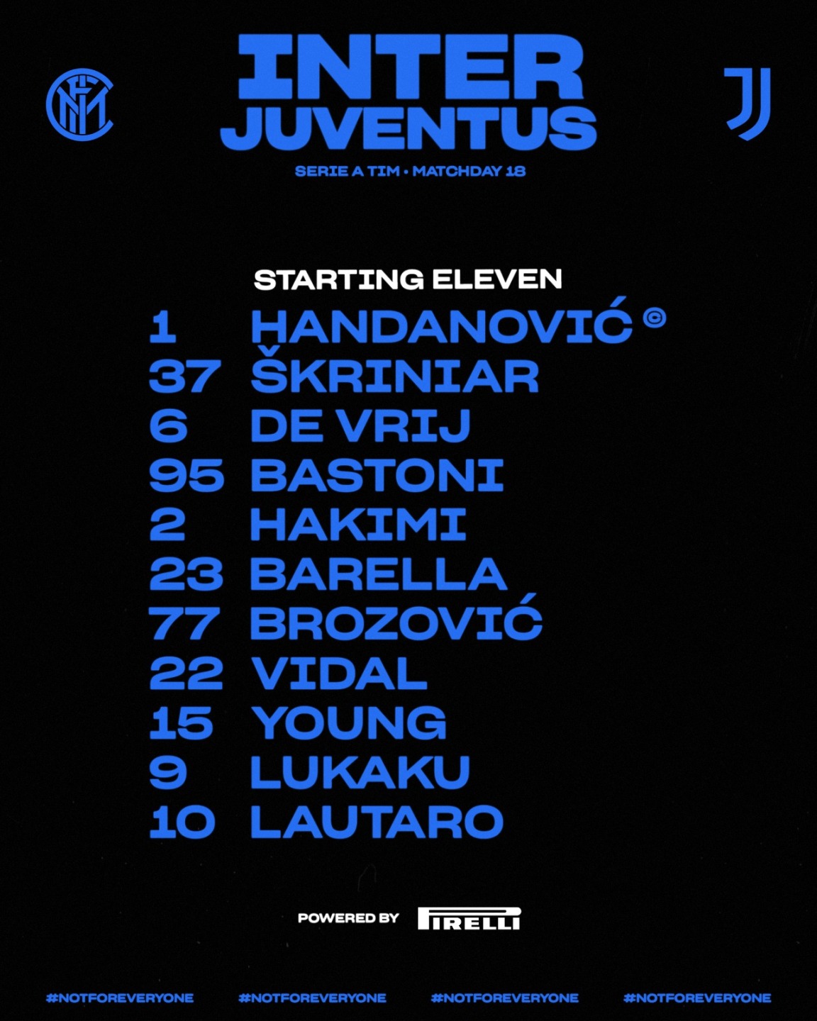 "Интер": Ханданович, Янг (Дармиан, 72), Бастони, де Врей, Хакими, Барелла, Брозович, Видаль (Гальярдини, 77), Шкриньяр, Лукаку, Мартинес (Санчес, 86).