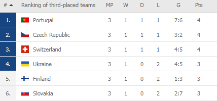 Из группы А В плей-офф вышли Италия, Уэльс, а также Швейцария с третьего места.