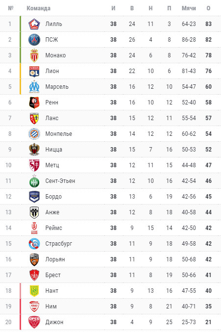 Победителем чемпионата Франции сенсационно стал "Лилль" с суммарной стоимостью игроков менее 300 миллионов евро. Это четвертый показатель в чемпионате Франции. Более того, "Лилль" по стоимости футболистов (297 млн) более чем на полмиллиарда евро уступает ПСЖ (828 млн), который занял второе место. Третьим стал "Монако", который сыграет в квалификационном турнире Лиги чемпионов. "Лион" и "Марсель" примут участие в Лиге Европы, в "Ренн" сыграет в Лиге конференций.