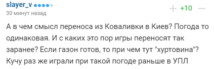 "А в чем смысл переноса из Ковалевки в Киев? Погода-то одинаковая. И с каких это пор игры переносят так заранее? Если газон готов, то при чем тут "хуртовина"? Кучу раз же играли при такой погоде раньше в УПЛ".