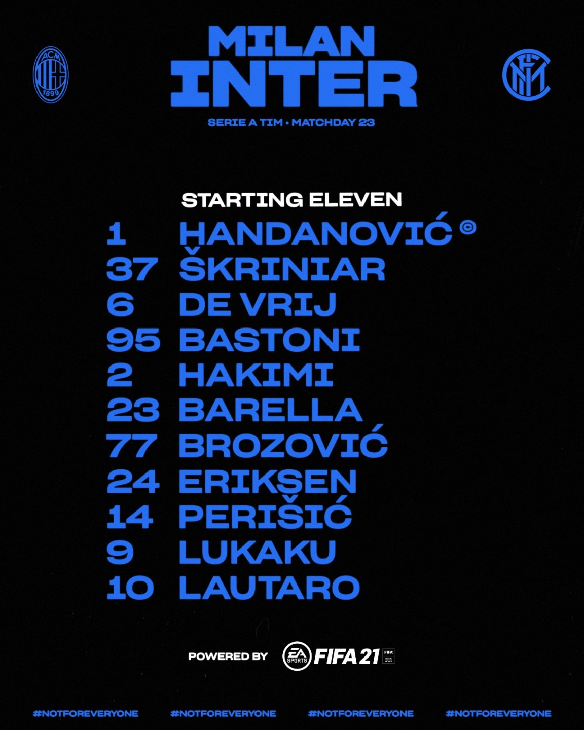 "Интер": Ханданович, Шкриньяр, Бастони, де Врей, Хакими (Янг, 83), Эриксен (Гальярдини, 78), Барелла (Видаль, 86), Брозович, Перишич (Дармиан, 78), Мартинес (Санчес, 79), Лукаку.