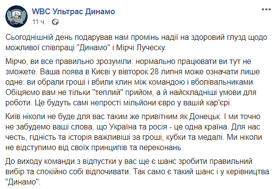 "Мирча, вы все правильно поняли: нормально работать вы здесь не сможете. Ваше появление в Киеве во вторник, 28 июля, может означать только одно: вы выбрали деньги и вбили клин между командой и болельщиками. Обещаем вам не только "теплый" прием, но и сложные условия для работы. Это будут самые непростые миллионы евро в вашей карьере", - говорится в заявлении.