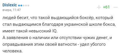 "Людей бесит, что такой выдающийся боксер, который стал выдающимся благодаря украинской школе бокса, имеет такой невысокий IQ. А заявления о наличии или отсутствии чужих денег, и оправдывания этим своей ватности - удел убогого человека".